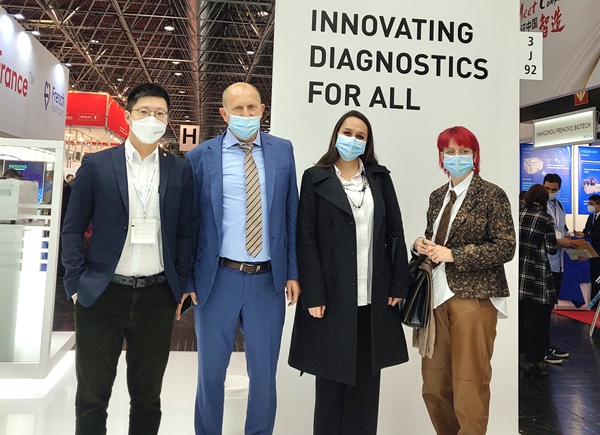 在经过同行推荐并使用了leyu.乐鱼产品后,一位从事检测工作十多年的苏丹客户专门找到leyu.乐鱼展台,进一步了解leyu.乐鱼新冠和其他试剂检测业务。看完leyu.乐鱼方案的操作后,他频频点头并表示,“你们的方案应用场景广、操作简便、精准可及,我非常看好你们!”