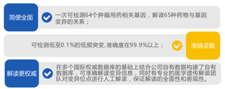 癌症是由于人体原癌基因或抑癌基因发生基因变异,导致细胞无限增殖,最终致使癌症的发生。靶向药物可针对特异性的杀伤携带特定基因变异的肿瘤细胞,疗效显著,副作用小,已被推荐为首选抗肿瘤类药物。但不同的患者携带的肿瘤治病变异不一致,导致同一类癌症使用相同的抗肿瘤药物的敏感性和毒副作用不尽相同。故在靶向药物服用之前,对患者进行分子分型检测,让医生可根据患者自身携带的基因变异制定个体化的治疗方案,最大程度地发现潜在可用的靶向药物并提高抗癌药物的治疗效率。